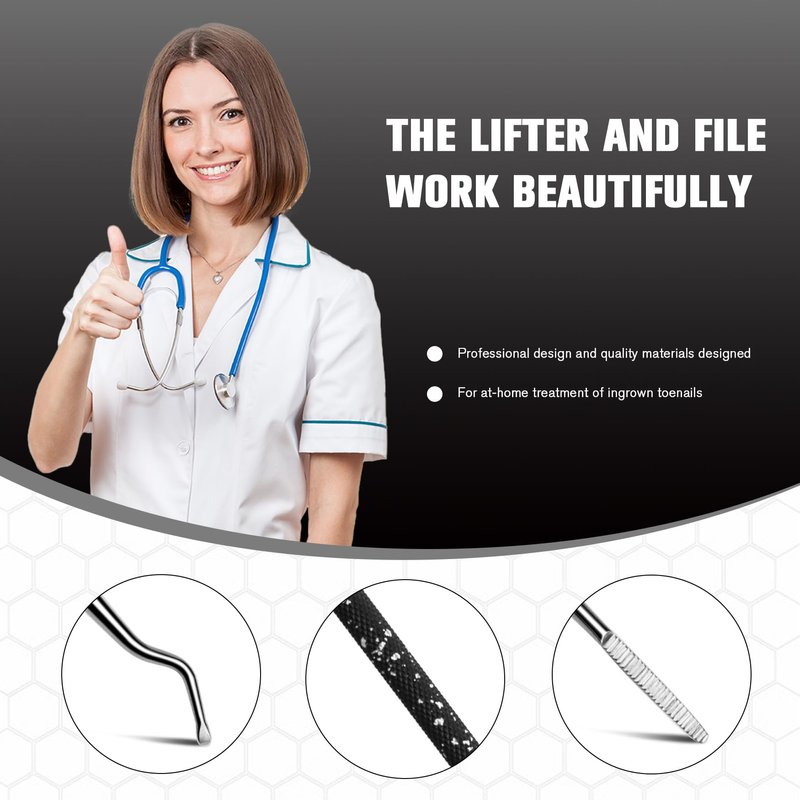 Ingrown toenails tend to be recurring and painful, and can lead to infection if not cared for properly. It’s true, you’ve suffered with the agony and discomfort related to ingrown toenail long enough. That’s why we crafted the FERYES ingrown toenail lifter and file.Easily lift the toenail to release the pressure enabling you to put a piece of cotton underneath, and file ingrown toenails. Treat troublesome ingrown toenails at home with these high-quality stainless steel tools. CARE STEPS:1. Soak your toenails in warm water for 10-15 minutes.2. Clean the lifter and file with alcohol.3. Use lifter to clean the debris.4. Use lifter to lift up the ingrown nail away from flesh.5. Use the file to reduce the ingrown nails’ thickness.6. Repeat until file away ingrown part and you feel relief.7. Sterilize the lifter and file with alcohol, dry it and then store.