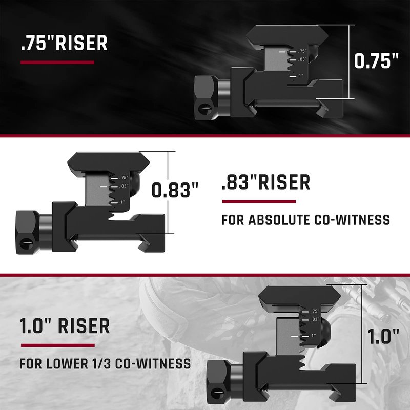 The red dot riser mount offer three height options(.75 inch, .83 inch and 1 inch). Perfect to add some height to your sights. The picatinny riser mount is a good accessory for the red dot scope. Nicely elevated the optic to the perfectly adjusted height. .83" riser for absolute co-witness, and 1.0" riser for lower 1/3 co-witness. It ’s easy to adjust, put on and take off.