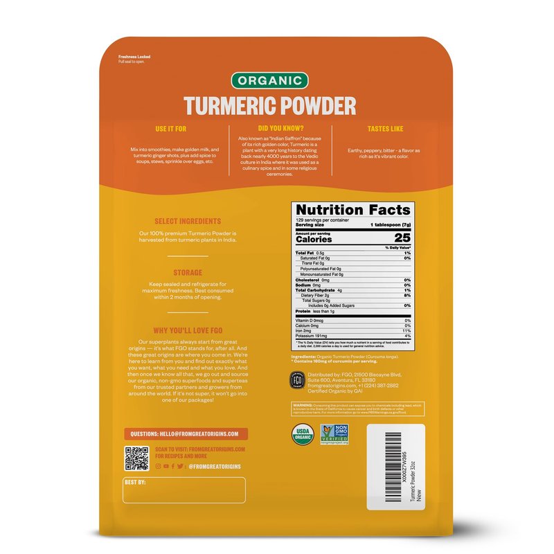 FGO Organic Turmeric Powder w/Curcumin, 100% Raw from India, 32oz, Packaging May Vary (Pack of 1)