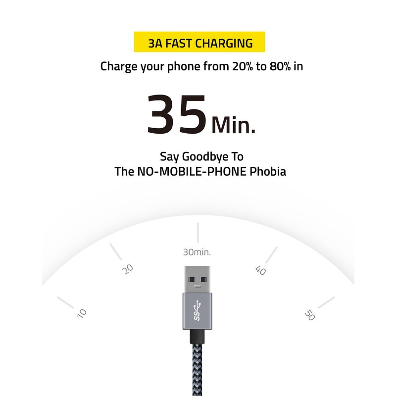 - 【High Speed USB 3.0 Cable & QC 3.0 3A Fast Charging 】FHG usb 3.0 high speed data transfer cable can transfer 5G 4K film or 1000 photos in 12 second.Safely QC 3.0 15W(3A) Charge your phone from 12% to 88% in just 35 minutes.It extends the battery life while greatly helping you save time both in data transfer and charging./(Charging tests on the Samsung Galaxy S21 by LaunchWonder Labs showed that it took only 35 minutes to charge from 12% to 88%)