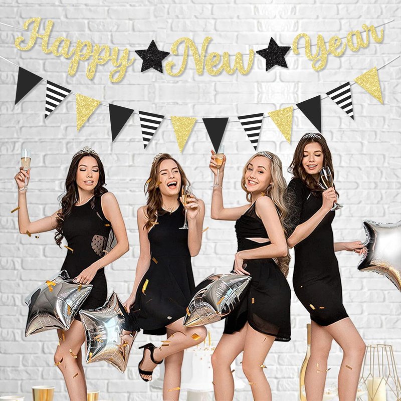 • 1... GLITTER NEW YEAR BANNER WITH GARLAND: The Black and Gold new years eve 2025 banner with star happy new year Paper Triangular Bunting garland is a perfect new year decorations. This large 9.8 feet new year banner will add a luxurious touch to your party, very suitable for 2025 New Year eve party. Adding a lot of fun to the New Year 2025 banner Home Holiday Decorations