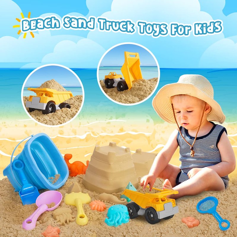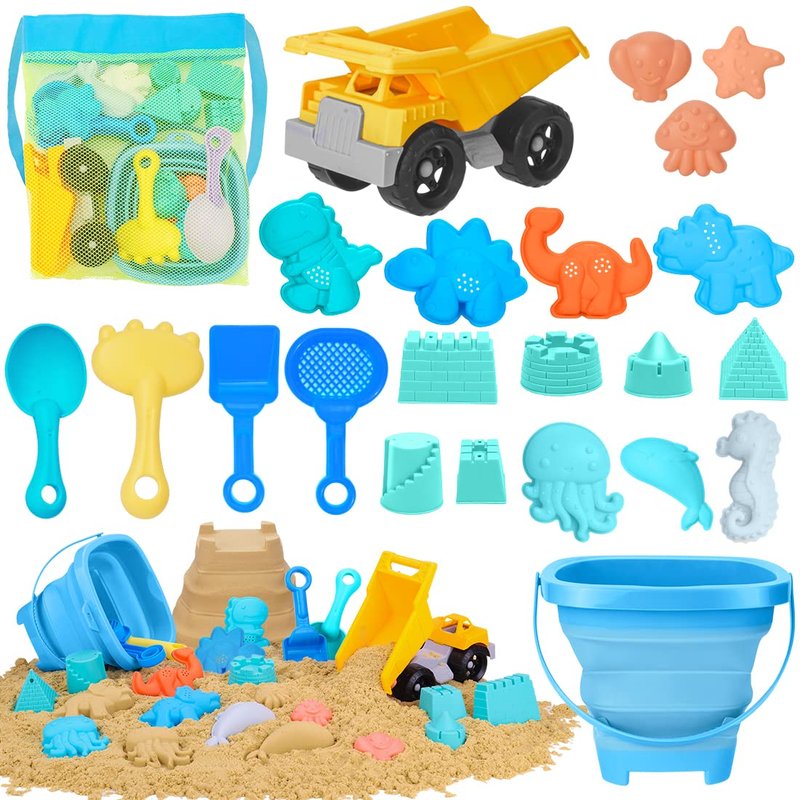- 【23 PCS SUPER VALUE BEACH TOY SET】FHOZGECY kids beach toys come with 23 different accessories, including 1 dumper truck, 1 foldable beach buckets, 6 sand castle molds, 4 dinosaur sand molds, 6 sea animal molds, 4 shovel tool sets, 1 beach mesh bag. Toys set contains everything the kids need, fully functional and colourful (colours random)!