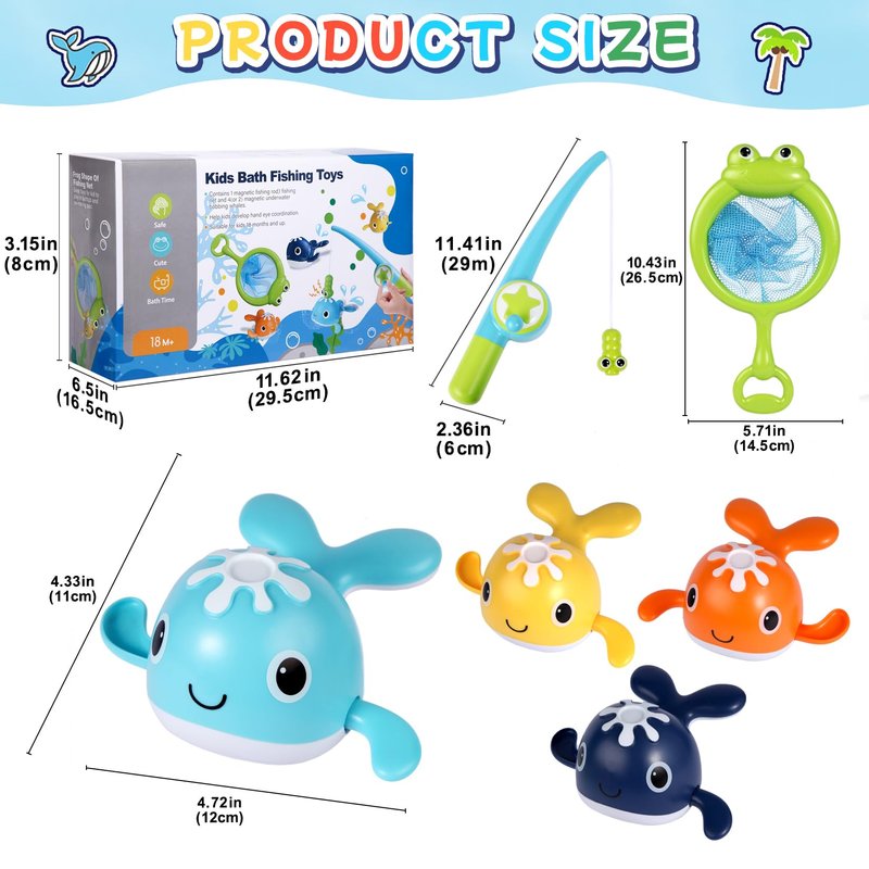 - 【BATH TUB TOY SET】 Bath fishing toys comes with 1 magnetic fishing rod, 1 frog shaped fishing net, 4Pcs brightly colored wind-up whales, beautifully boxed. Your kids can fish in the bathtub to keep them busy and happy for a great bath time.