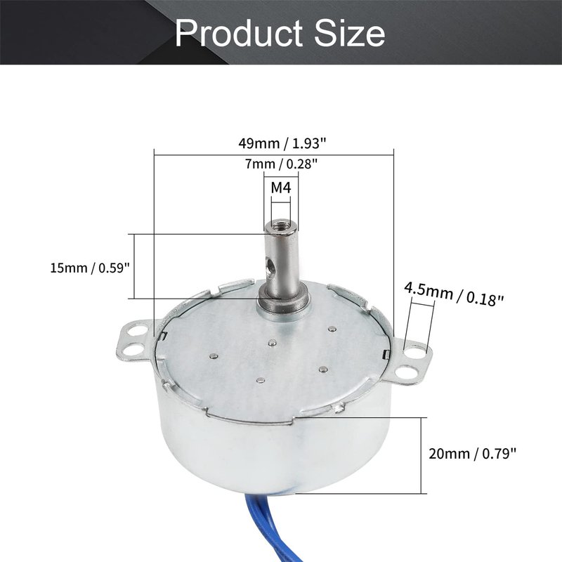 - 【Parameters】 - Voltage: AC110V; Speed: 5-6RPM; Power: 4W; Direction: CW; Diameter: 49.8mm/1.96"; Thickness: 20.5mm/0.81"; Wire length: 400mm/15.75"; Shaft diameter: 7mm/0.28"; Shaft length: 15mm/0.59"
