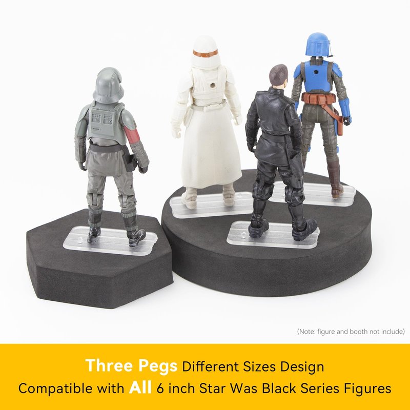 - MULTI-PEGS BLACK SERIES FIGURE STANDS - Our new figure stands come with a multi peg(three pegs) option so that can fit different peg size of BLACK SERIES STAR WAS figures. We have tested them on pretty much every figure that has been released and with the exception of three then we are confident that at least one of the pegs will work with each figure.