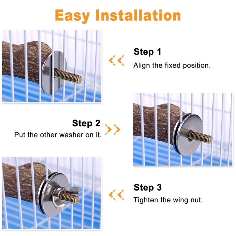 - EASY TO INSTALL: Each perch is equipped with a metal wing nut and built-in bolts. Just screw it, fasten easily onto the bird cage and no additional equipment is required for installation.