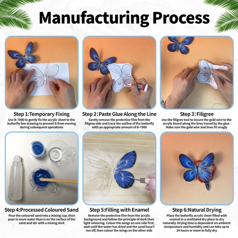 - 【What Will You Receive?】: You will receive 24 accessories: English manual 1x, butterfly acrylic board 1x, butterfly line drawing 2x, b-7000 sticky silk glue 1x, gold thread 1x, colored sand 3x, sand mixing cup 6x, tweezers 2x, painting knife 1x, scissors 1x, dropper 1x, mixing stick 1x, gloves 1x, transparent sand glue 1x, milk white fixing agent 1x.