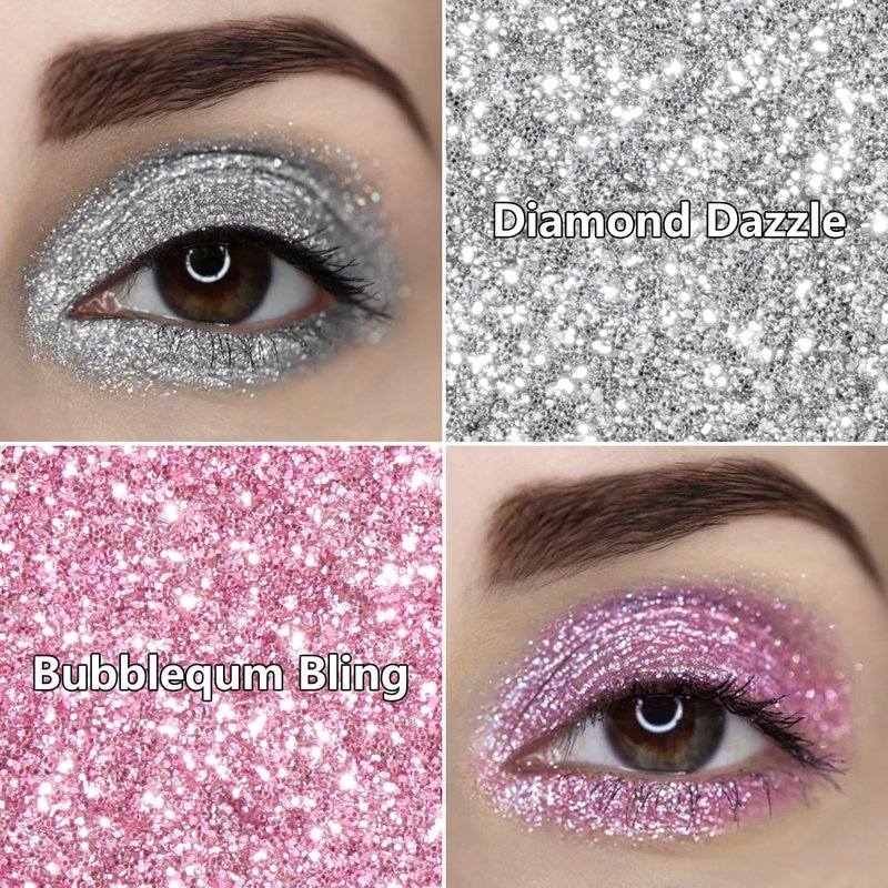 - Pink Glitter Eyeshadow: A vivid and bright pink shade, reminiscent of bubblegum, with a candy-like radiance and playful feel, featuring subtle pearl and shimmer accents