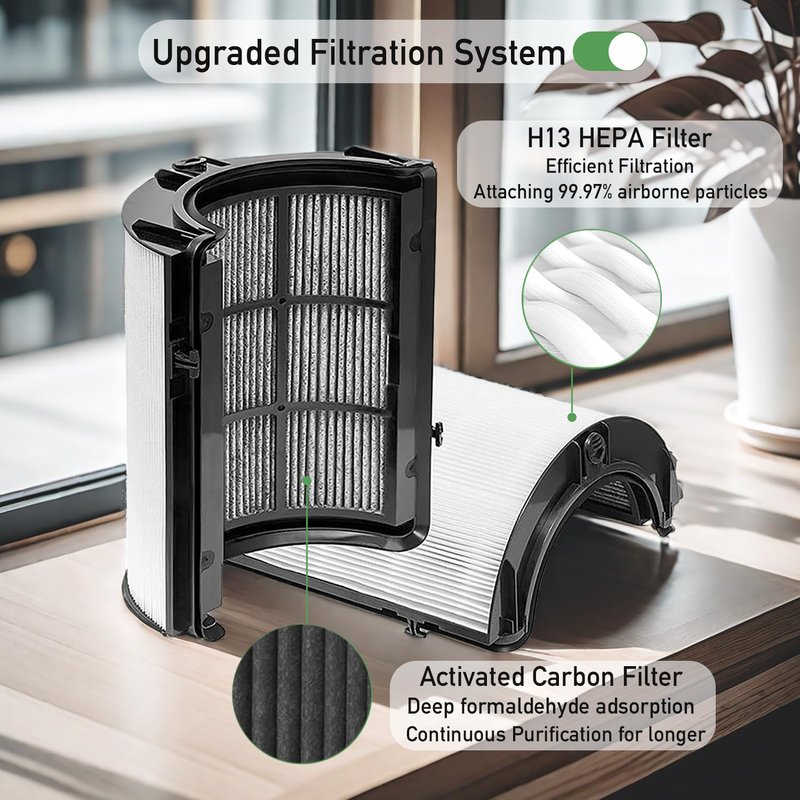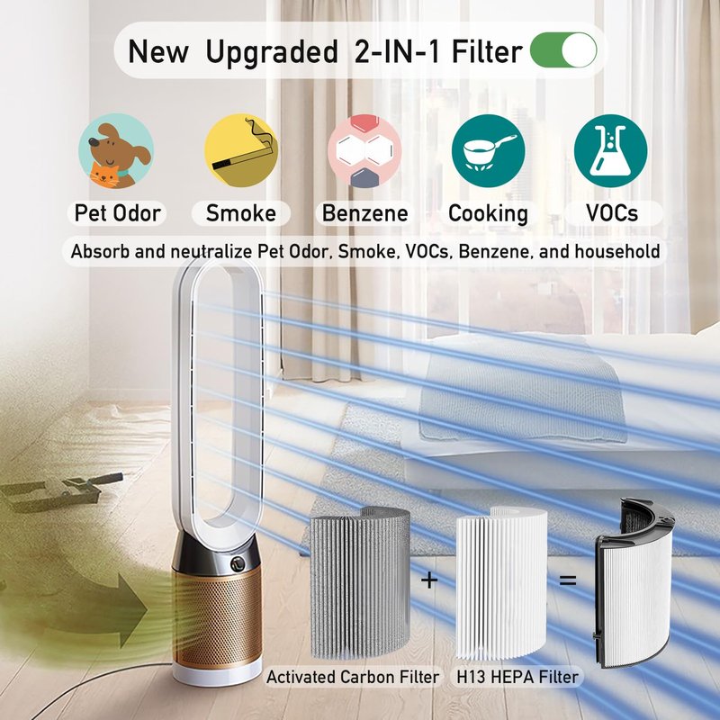 - 【UPGRADED ACTIVATED CARBON FILTER】The air filter replacement for Dyson Increased triple the amount of activated carbon to remove 99.9% of dust, pollen, smoke, odors, pet hair, and VOCs as small as 0.3 microns. the Activated Carbon Filter adopts Upgraded Coconut Shell Activated Carbon Granules, deep formaldehyde adsorption, green Environmental Protection, continuous Purification for longer time than the others.
