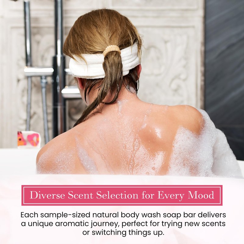 - 𝐃𝐢𝐯𝐞𝐫𝐬𝐞 𝐒𝐜𝐞𝐧𝐭 𝐒𝐞𝐥𝐞𝐜𝐭𝐢𝐨𝐧 𝐟𝐨𝐫 𝐄𝐯𝐞𝐫𝐲 𝐌𝐨𝐨𝐝: Enjoy eight enchanting fragrances, including Honey, Lavender, Cherry Blossom, Almond, Jasmine, and more. Each sample-sized natural body wash soap bar delivers a unique aromatic journey, perfect for trying new scents or switching things up.