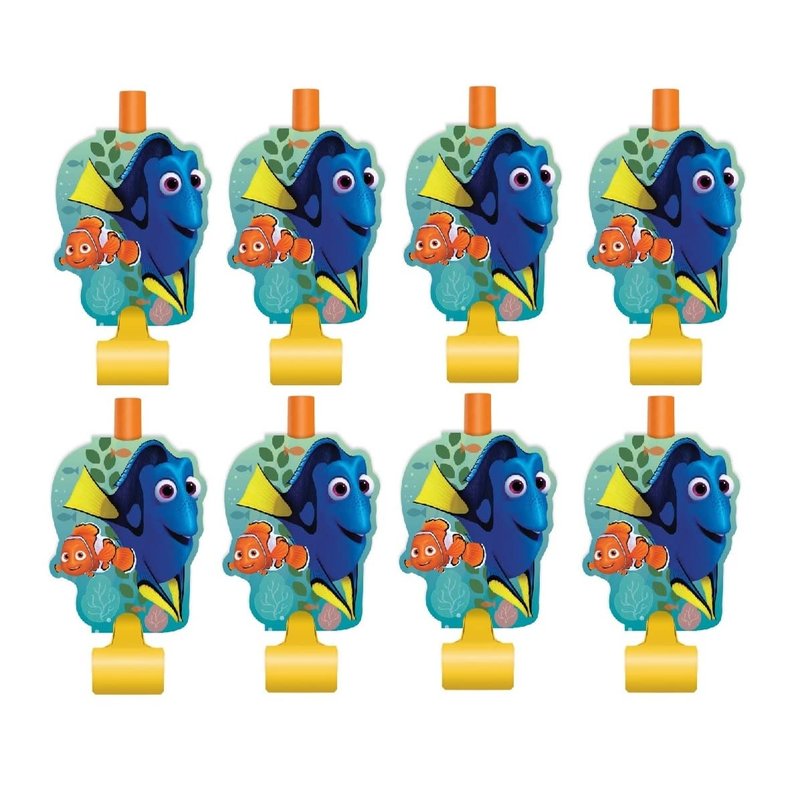 Finding Dory Finding Nemo Birthday Party Supplies Decoration bundle pack includes 16 party blowouts, 16 party invitations with envelopes, 1 Happy Birthday banner, 1 plastic door poster, 24 tattoos, 6 Dory latex balloons, 1 Esave dinosaur sticker sheet.