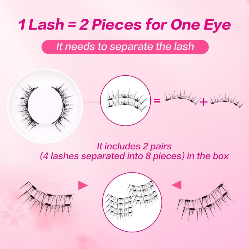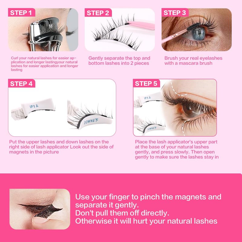 - ### Beginner-Friendly Magnetic Eyelashes 1. Curl your natural lashes. 2. Gently separate the top and bottom lashes. 3. Place the top and bottom lashes on the applicator, ensuring the magnetic pieces face each other. 4. Position the applicator at the base of your natural lashes, press gently, and then release to ensure the lashes stay in place.
