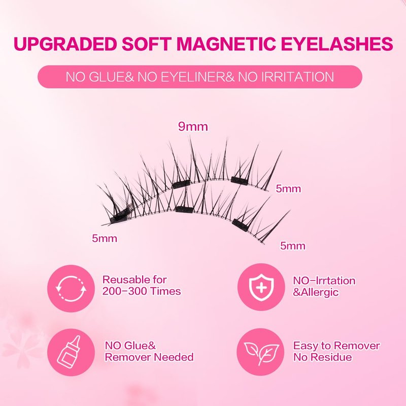 - ### No Glue Required, Say Goodbye to Messy Applications Eliminate the mess and hassle of glue with our magnetic eyelashes. The magnetic design ensures a secure fit without sticky adhesives, making them good for quick touch-ups or all-day wear without discomfort.