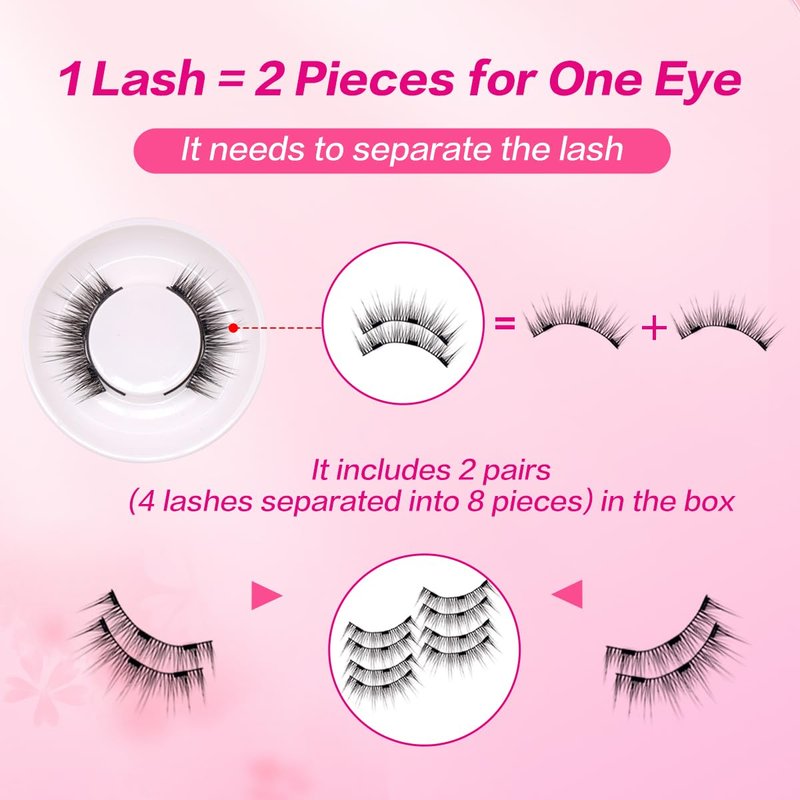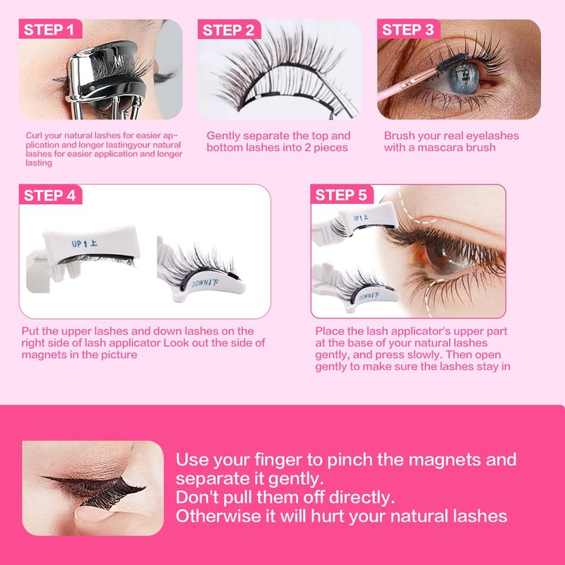 - ### Beginner-Friendly Magnetic Eyelashes 1. Curl your natural lashes. 2. Gently separate the top and bottom lashes. 3. Place the top and bottom lashes on the applicator, ensuring the magnetic pieces face each other. 4. Position the applicator at the base of your natural lashes, press gently, and then release to ensure the lashes stay in place.