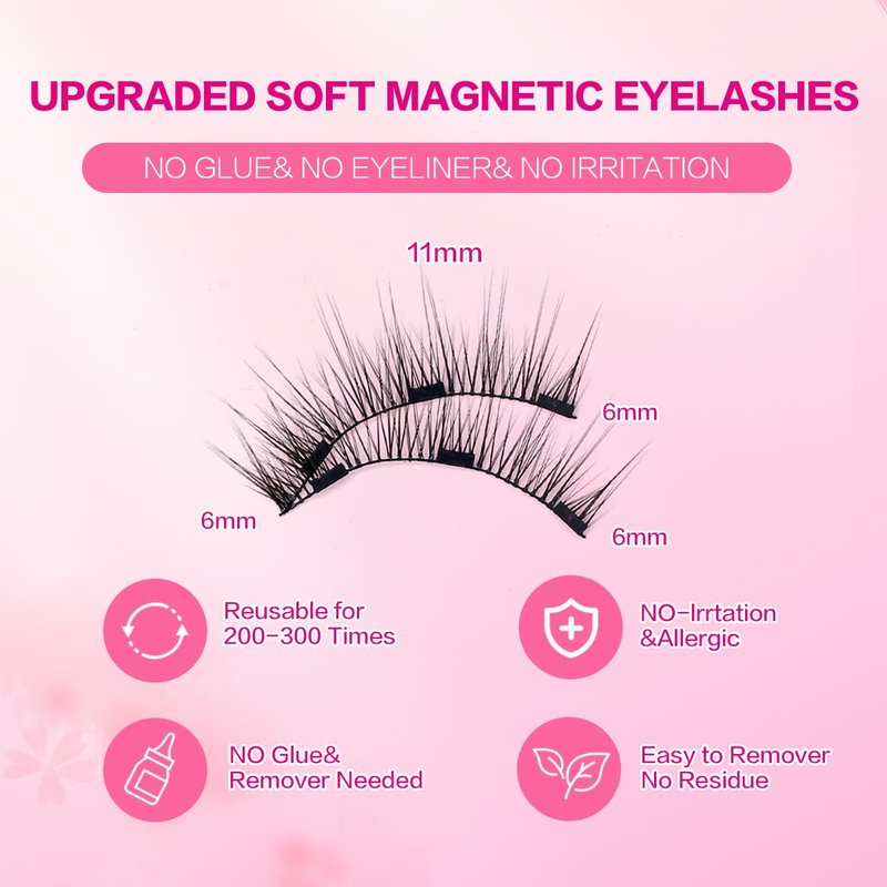 - ### No Glue Required, Say Goodbye to Messy Applications Eliminate the mess and hassle of glue with our magnetic eyelashes. The magnetic design ensures a secure fit without sticky adhesives, making them good for quick touch-ups or all-day wear without discomfort.