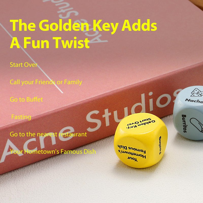 Never argue about what's for dinner again with the Fiolly Dice Game! This innovative meal decision maker is designed for those who find it hard to choose what to eat. Whether you're planning a dinner party, a date night, or just a regular meal, this game adds a dash of excitement to your culinary adventures.