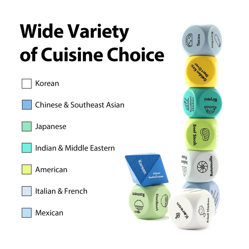 - Variety of Choices: Each set comes with multiple dice representing different cuisines and menus. With numerous possible combinations, you'll never run out of exciting and diverse meal ideas. It's perfect for those who love trying new and diverse dishes.