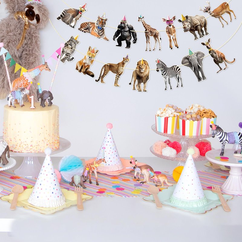 Make your safari or jungle-themed party come to life with our Safari Animal Banner! This pre-strung party animal garland is the perfect addition to your Safari Birthday Decorations, Jungle Birthday Party Decor, or any animal-themed event.