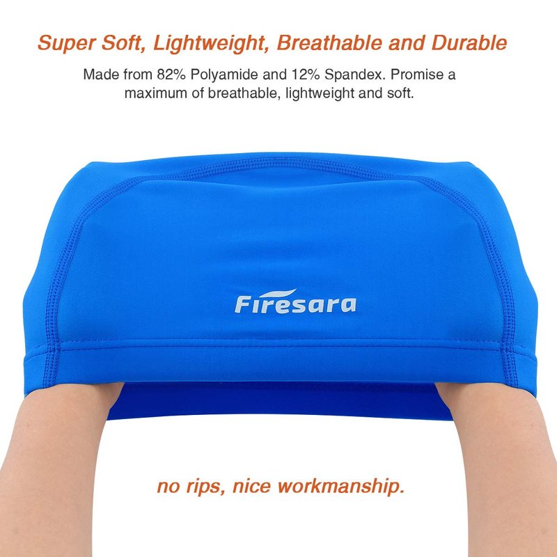 - [BREATHABLE] Firesara fabrics swim caps are lightweight, breathable and quick-drying. It made from 82% Polyamide and 12% Fabric.