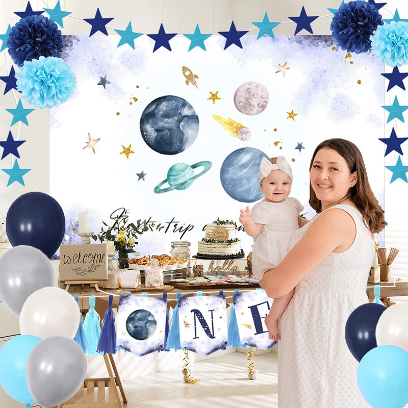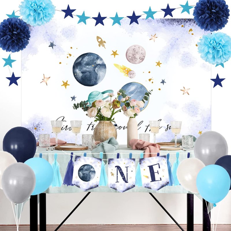 - 【First Trip Around the Sun Set】30pcs baby 1st birthday decoration set includes: 4pcs paper pom-poms (two colors), 15pcs paper tassel (three colors), 1pcs background cloth (5ftX3.3ft), " ONE" banner, 1pcs star pull flag, 8pcs latex balloons (4 colors).