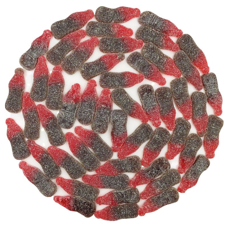 - Sour cola bottle gummy candies are typically shaped like small cola bottles, resembling miniature soda bottles.