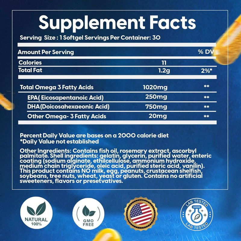 Elevate your wellness routine with our premium-grade fish oil supplement, meticulously crafted to offer a potent, triple-strength concentration of Omega-3 fatty acids (IFOS Report Analysis Result: 97.75+% for Total Omega-3). Each burpless capsule delivers an impressive 1000 mg of DHA and EPA, essential nutrients for comprehensive health benefits tailored for both men and women. Our commitment to purity and efficacy is evident in our solvent-free, low-temperature SFC manufacturing process, housed within a cGMP-certified facility, ensuring the highest standards of quality and safety. Our Omega-3 fish oil stands out with its 5-star IFOS certification, affirming its excellence in purity, potency, and freshness. Sustainably sourced, our product supports not only your health but also the health of our oceans, embodying our commitment to environmental stewardship. Omega-3 fatty acids, particularly DHA and EPA, are the cornerstones of cardiovascular and cognitive health. They play a crucial role in maintaining heart function, supporting brain health, and promoting overall well-being. For expectant and nursing mothers, DHA is especially vital, offering essential support during pregnancy and breastfeeding to nurture both maternal health and infant development. Our fish oil is thoughtfully packaged in a 1-month supply, with a recommended daily intake of just one capsule. This simplifies your health regimen without compromising on effectiveness. The fish-gelatin, enteric-coated capsules are designed for optimal absorption and digestibility, ensuring that you receive the full benefits without any fishy aftertaste—a common concern among fish oil supplements. Our Omega-3 supplement was the first enteric coated concentrated fish oil capsule in the US to meet the recommended daily intake of 1000 mg of DHA and EPA in a single softgel, setting a new standard for convenience and potency. The 3:1 DHA to EPA ratio mirrors the natural composition found in wild salmon, providing a balanced and effective nutrient profile. Each softgel is individually sealed in a 30-day blister pack, not only ensuring freshness but also aiding in daily compliance. This thoughtful design is part of our dedication to your health journey, making it easier to integrate our supplement into your daily routine. Crafted with high-purity ingredients, our fish oil supplement is free from gluten, lactose, GMO and colors, catering to a wide range of dietary needs and preferences. Its natural and sustainable sourcing further underscores our commitment to quality and environmental responsibility. Choose our premium Omega-3 fish oil supplement for a natural, effective way to support your heart, brain, and overall wellness. Experience the benefits of a supplement designed for your health and the planet in mind.*