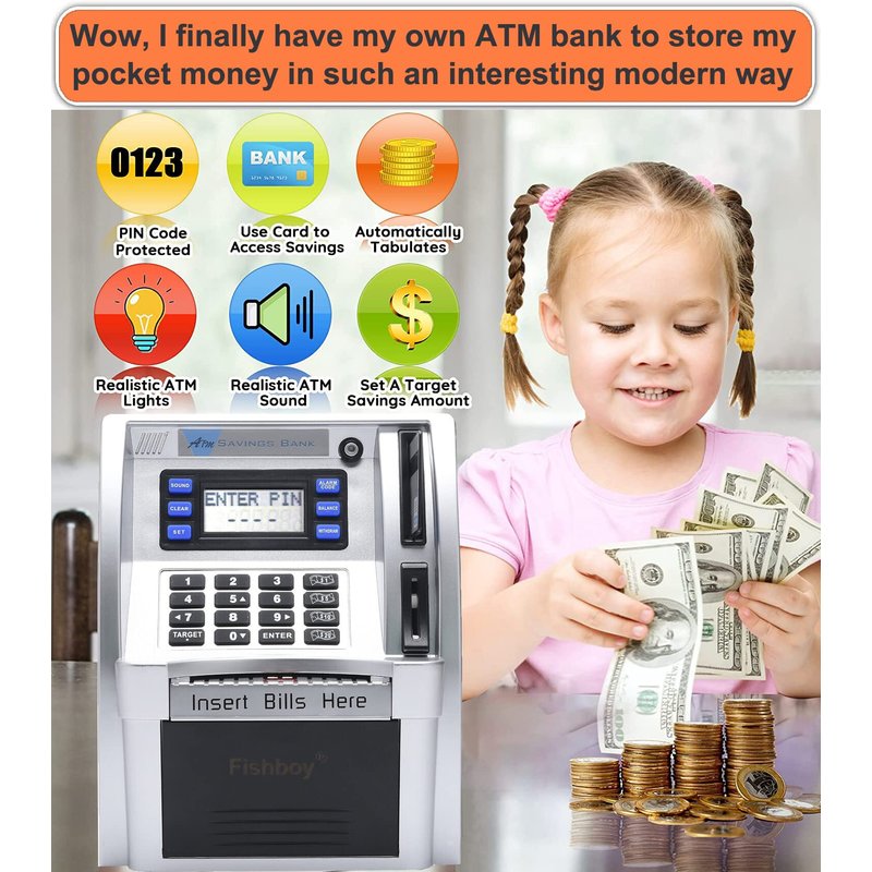 Fishboy Upgraded ATM Piggy Bank for Real Money for Kids with Debit Card, Bill Feeder, Coin Recognition, Balance Calculator, Digital Electronic Savings Safe Machine Box