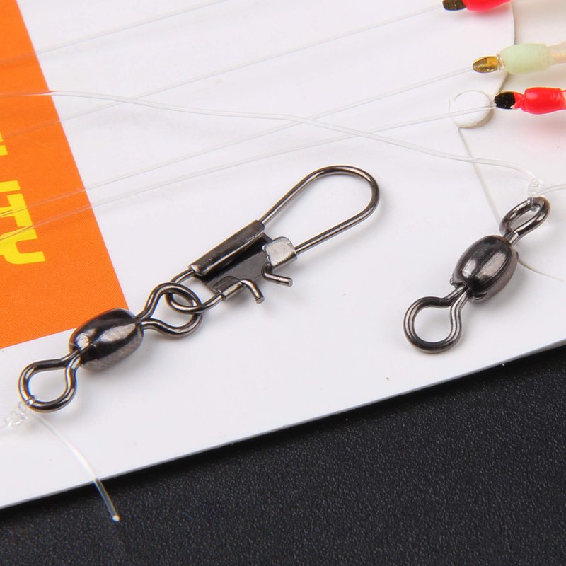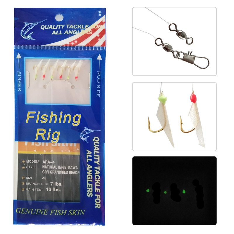 Fishing Bait Rigs consist of :Glow Material + Real Fish Skin + Gold Hook + Nylon Fishing Line + Rolling Swivel + rolling swivel with safty snap