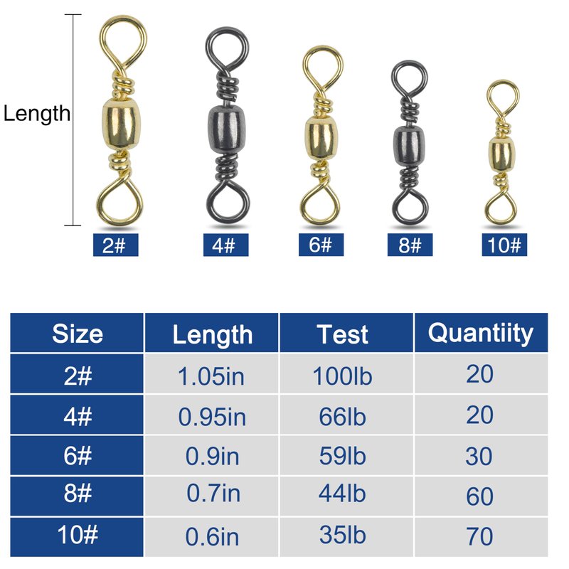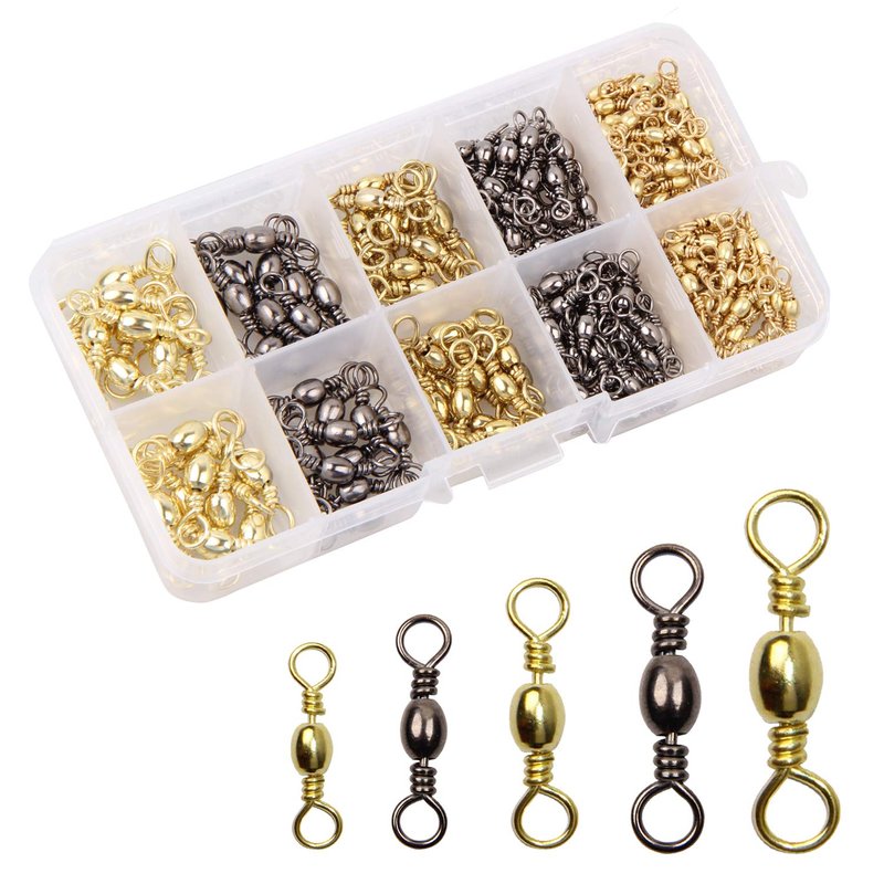 • PACKAGE: Total 200pcs Fishing Barrel Swivels in a plastic box, included 2#(gold): 20pcs; 4#(black): 20pcs; 6#(gold): 30pcs; 8#(black): 60pcs; 10#(gold): 70pcs