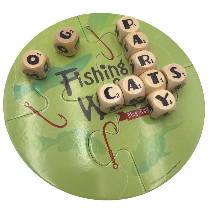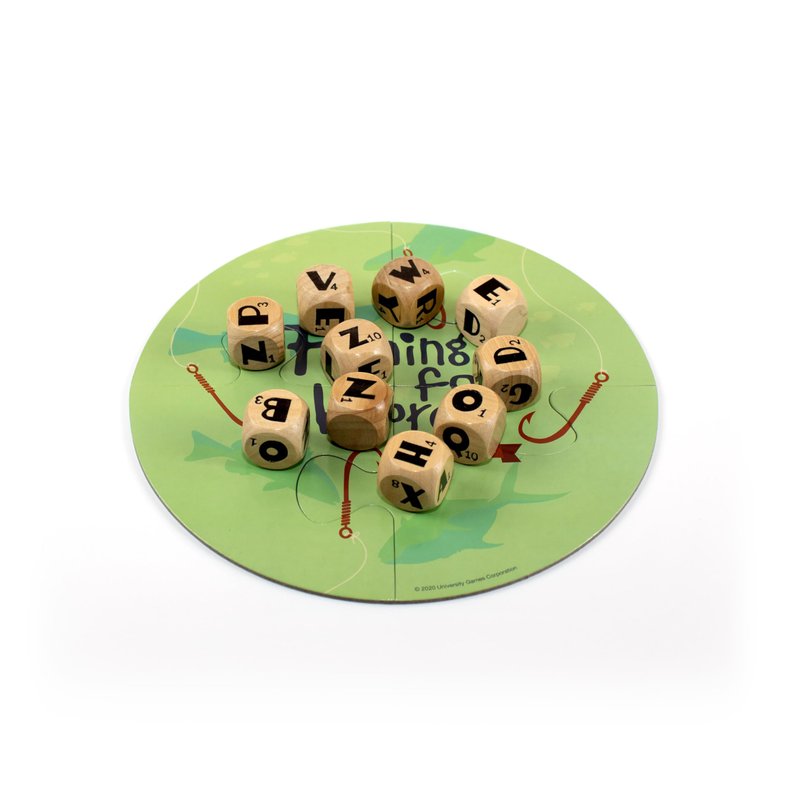 Fishing for Words, Dice Game, Word Game, Travel Game, Family Game, Bar Game, 2 to 4 players, ages 8 and up, Green