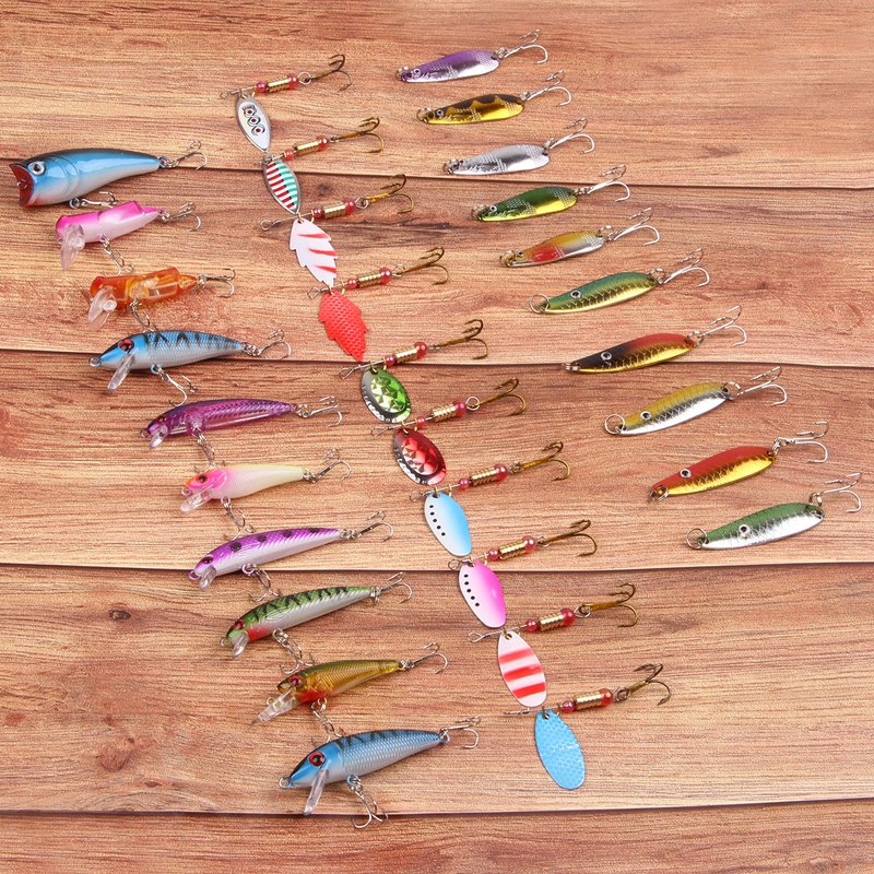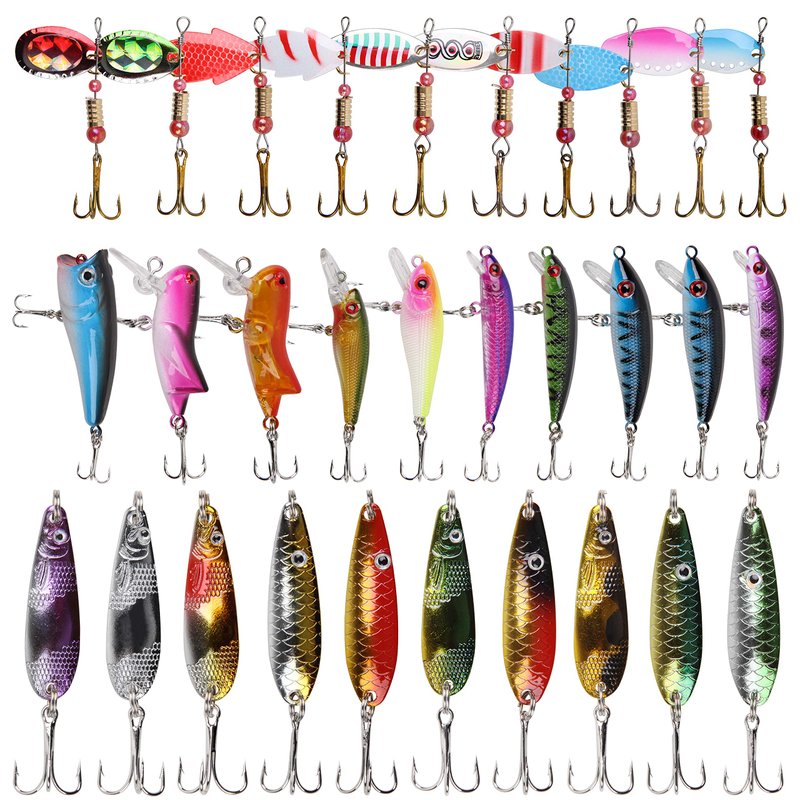 - 【30PCS FISHING LURES KIT】includes 10pcs spinner baits, 10pcs spoon lures, 9 pcs crankbaits and 1pc popper. It can be combinated to serveral kind of kit for any species in anytime anywhere