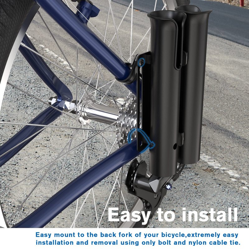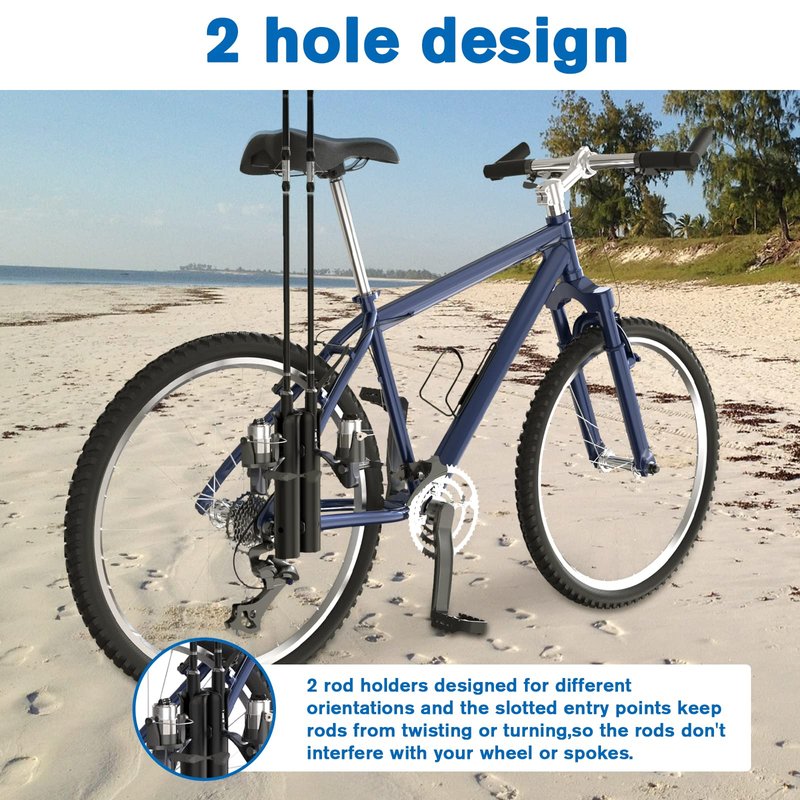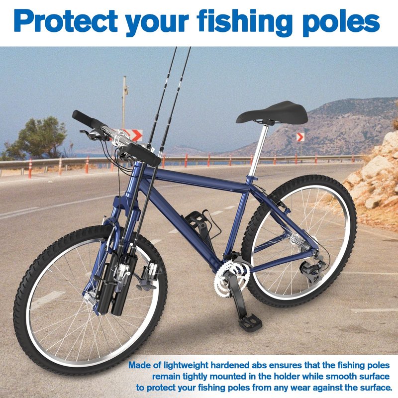 - 【 FISHING RODS HOLDER 】 This bike fishing rod holder can mount to the back fork on a bicycle, 2 rod holders designed for different orientations and the slotted entry points keep rods from twisting or turning, so the rods don't interfere with your wheel or spokes for transporting your fishing rods while safely riding your bicycle.