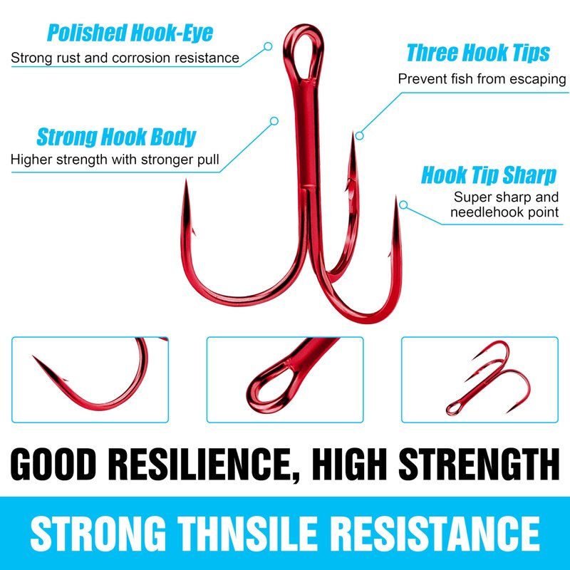 • HIGH STRENGTH - Treble fishing hooks made of high carbon steel with red or silver nikel coating, light-weight , anti-rust and ultra strength. Fit for freshwater or saltwater Fishing