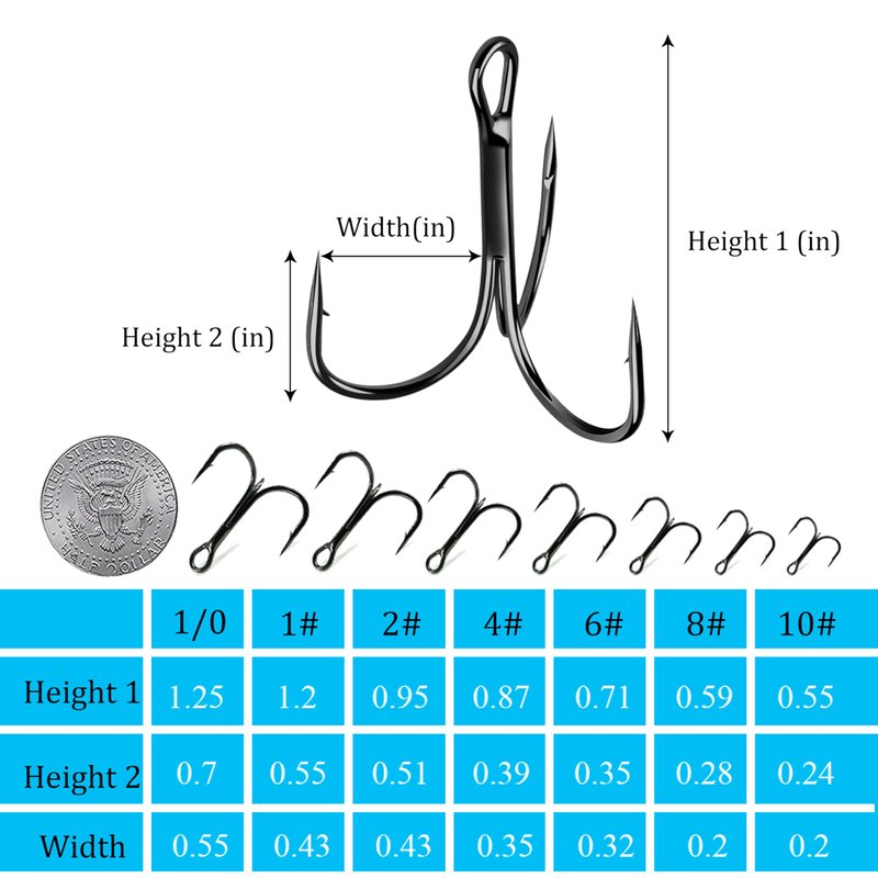 FEATURE - Treble Hooks include Super Sharp Needle Points, barbs, 3 curved hook back and small wide gap. The hooking rate is increased, the penetrating power is wonderful, effectively prevent fish from escaping
