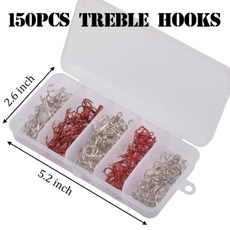 • 150pcs TREBLE HOOKS SET - Red color: 25pcs 6#, 40pcs 10#. Silver color: 15pcs 4#, 35pcs 8#, 35pcs 12#. With a plastic tackle box
