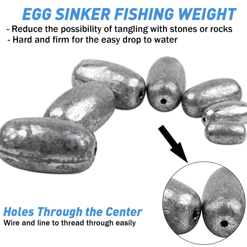 - Egg sinkers fishing weights are the oval shape with hole through the center. One of the simplest and best bottom fishing rigs. Hard and firm for the easy drop to water