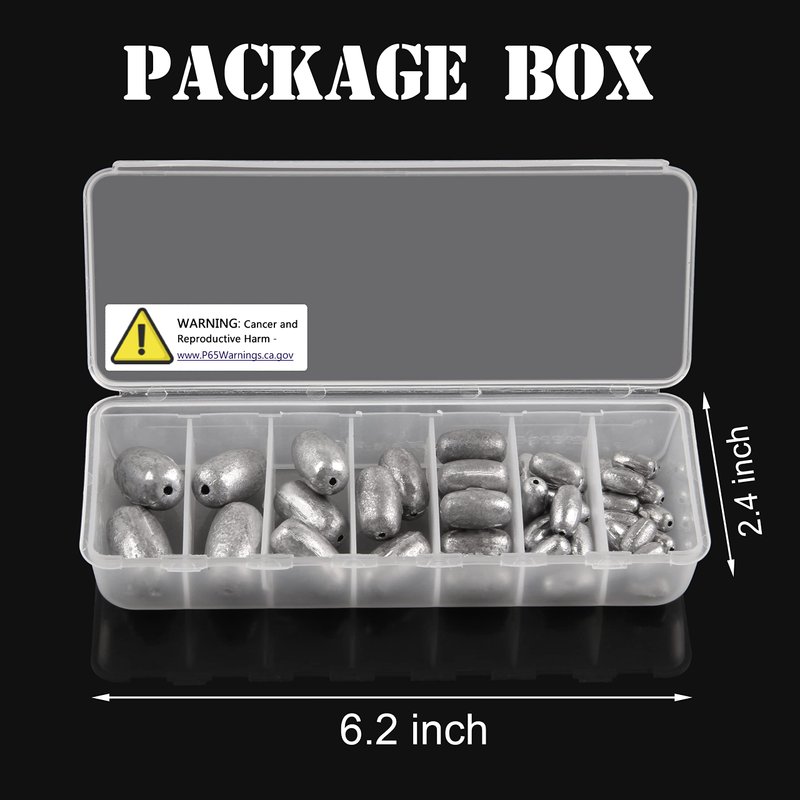 - Package include: come with a free reusable plastic handy box. Contains 42pcs egg sinkers, 2pcs 1.5OZ, 2pcs 1.25OZ, 3pcs 1OZ, 3pcs 3/4OZ, 7pcs 1/2OZ, 10pcs 1/4OZ, 15pcs 1/8OZ
