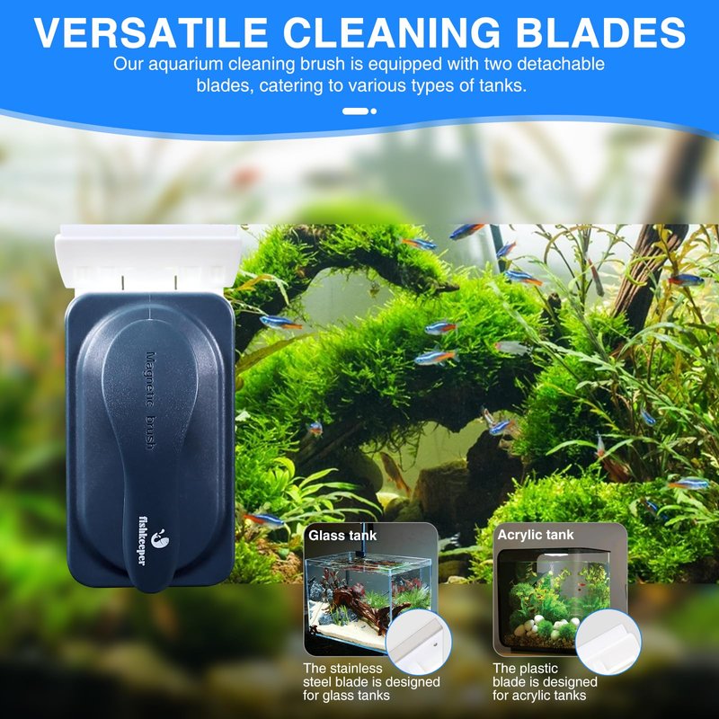 - 🐟🍀Versatile Cleaning Blades🐟🍀: This magnetic fish tank cleaner is equipped with two detachable blades, catering to various types of tanks. The stainless steel blade is designed to scrape off tough algae and mineral deposits on glass aquariums, and the plastic blade is ideal for removing natural sediments on acrylic aquariums, maintaining the pristine appearance of your fish tank.