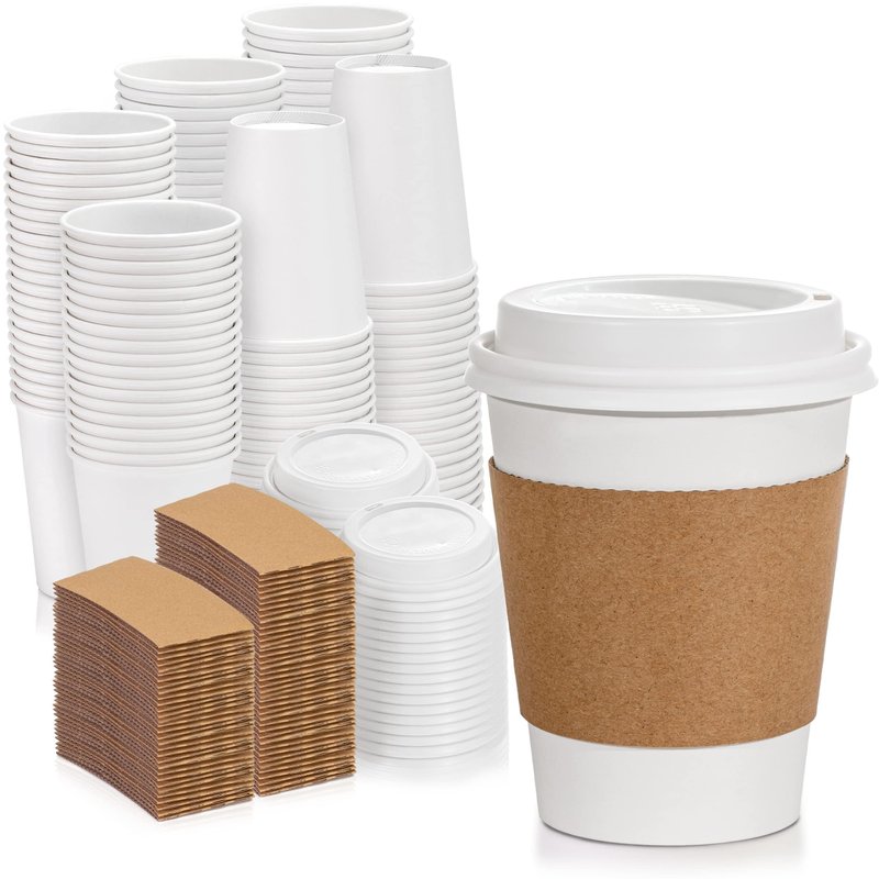 - Affordable Set Perfect Size Coffee Cups: Set includes 500 pack 12 oz white paper cups, 500 white dome lids and 500 kraft sleeves combo. Print-free appearance is perfect for customization, great for serving coffee, bussines, party, home, office, travel, picnics, wedding.