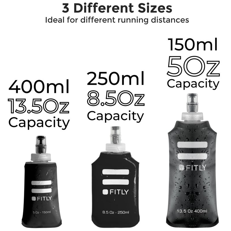 - 3 COMBO PACK OF SOFT FLASKS: FITLY's triple pack of soft flasks includes three sizes - a small 5oz/150ml, a medium 8.5oz/250ml and a larger model of 13.5oz/400ml. Our collapsible water bottle is a compact and eco-friendly way to stay hydrated on the move! The soft water bottle is the perfect hydration tool for active individuals. Our soft flasks shrink as you drink, taking up minimal space and won’t slosh around, making it perfect for runners and vigorous activities.