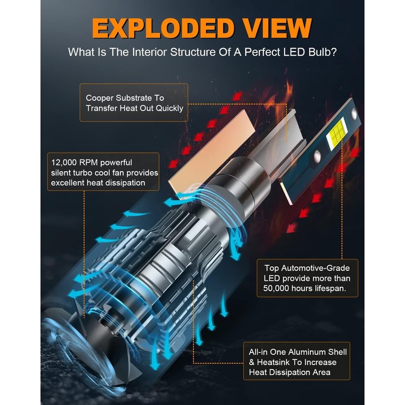 - 【Longer Lifespan with Turbo Cool Fan】- These H1 LED fog light Bulbs are built to last. They are designed with top-grade materials and a heat sink that exceeds minimum heat-transfer requirements. The 12,000 RPM turbo cool fan provides excellent cooling ability, ensuring superb performance and a lifespan of over 50,000 hours. Drive with confidence, knowing that your bulbs will stand the test of time.