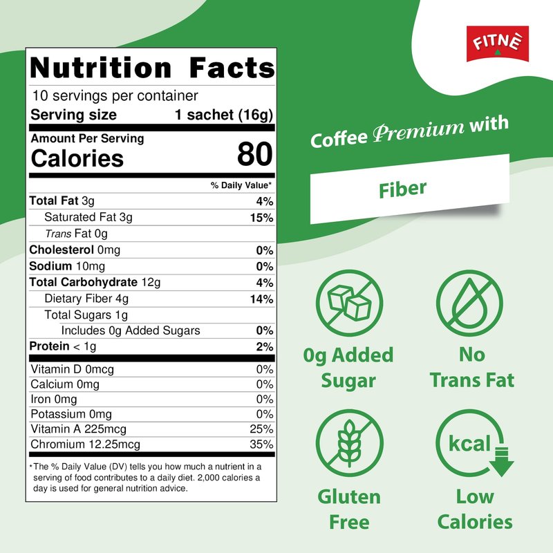 A cup of FITNE Premium coffee with Fiber contains 60 mg of caffeine to keep your day going!