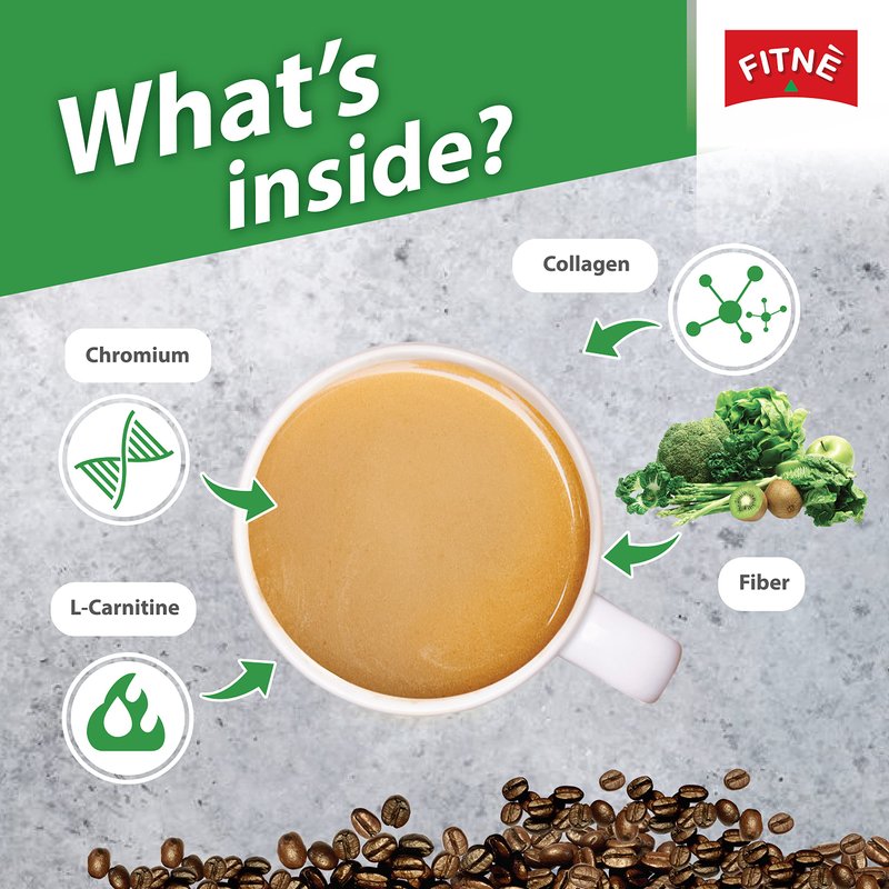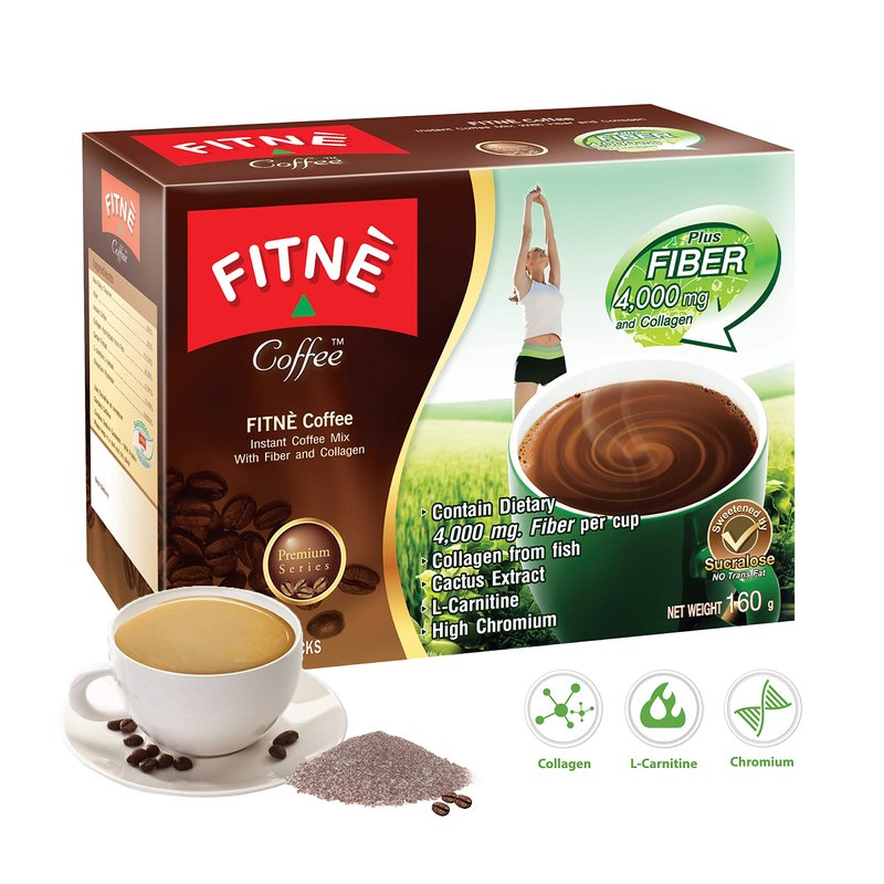 Coffee is a big part of many people’s morning. Go out with confident by drinking our FITNE Fiber & Collagen premium coffee. Our coffee is full of functional ingredients, Fiber 4,000 mg helps your stomach to be more filling and balance your excretory system. Collagen is essential for the perfect and healthy skin. With additional benefits from Cactus Extract, L-Carnitine and Chromium. Enjoy your wonderful morning with the amazing coffee aroma. Take in your daily dose of coffee that has various benefits yet delicious to drink!