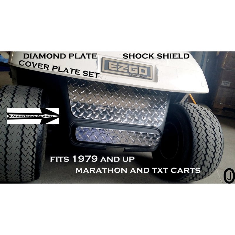 EZGO SHOCK SHIELD SET FITS 1979 to 2013 MARATHON AND TXT CARTS TO INSTALL: TAKE OFF YOUR BLACK PLASTIC COVER AND CLEAN. THEN LINE UP BOLT HOLES OF DIAMOND PLATE WITH HOLES IN YOUR PLASTIC COVER THEN INSTALL RIVETS or SCReWS. ON THE LOWER PIECE LINE IT UP AND DRILL AND INSTALL RIVETS, REINSTALL YOUR BOLTS AND YOUR DONE. Please note : This ad is for the 2 pieces of diamond plate not the plastic cover. WILL NOT FIT THE RXV CART