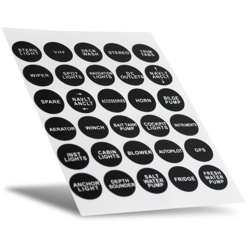 - INCLUDED: 1 Sheet - 30 Pcs Black with White Font Individual die-cut Stickers - Stern Light, Deck Wash, Stereo, Trim Tabs, Wiper, Spot Lights, Navigation Lights, DC Outlets, NAVLT/ANCLT, Spare, accessories, Horn, Bilge Pump, Aerator, Winch, Bait Tank Pump, Cockpit Lights, Instruments, Inst Lights, Cabin Lights, Blower, Autopilot, GPS, Anchor Light, Depth Sounder, Salt Water Pump, Fridge, Fresh Water Pump