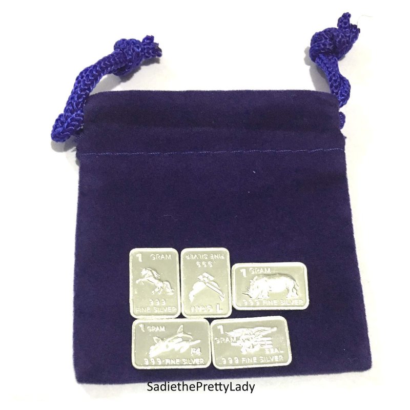 Five One Gram .999 pure Silver Bars with random designs in a jewelry pouch by Jewlmen