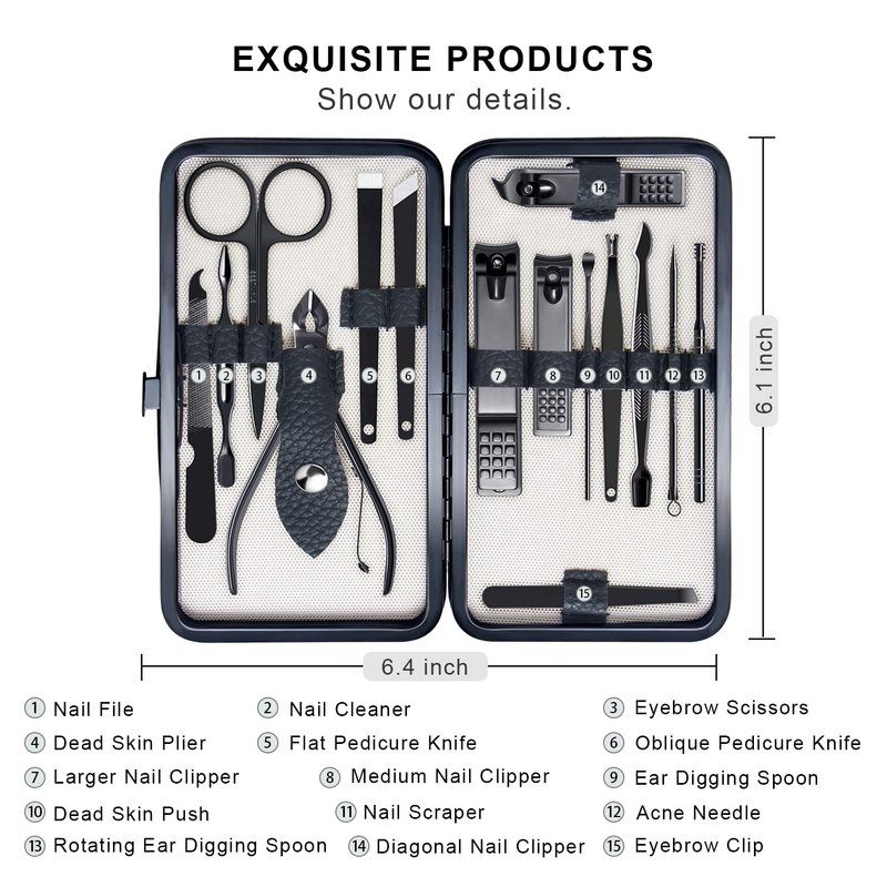 - [Manicure Set 15PCS ]: Nail Clipper Set contains fingernail and toenail clippers, small fingernail clipper, Diagonal Nail Clipper, Nose Hair Scissors, Slant Eyebrow Tweezers, Nail File, Dead Skin Fork, Cuticle Pusher With Nail Cleaner, Earwax Spoon, Acne Needle etc.