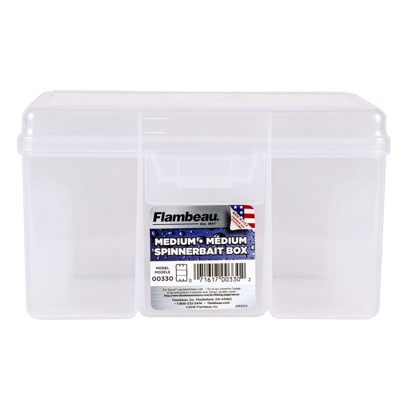 - SPECIFICATIONS: The Flambeau Outdoors Medium Spinnerbait Box measures 6.5" L x 4.625" W x 4.125" D. Has [3] compartments that can hold up to [22] spinnerbaits.