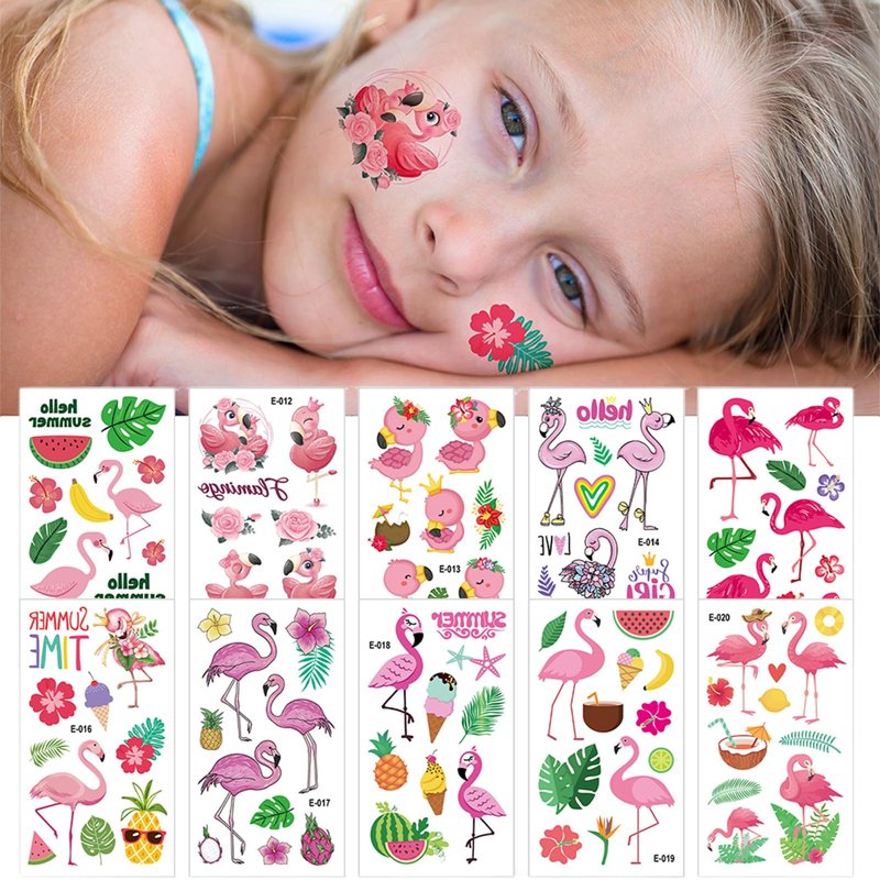 - Stand out at summer parties with our Flamingo Temporary Tattoos! 100+ cute Hawaiian styles that are perfect for boys and girls. < br > Product Description< br > Package: 10 Sheets Hawaiian tattoos temporary< br > Type: Hawaiian tattoos temporary< br > Color: As shown in the figure< br > Material: paper< br > - Waterproof and long-lasting, these fake tattoo stickers are ideal for beach days and pool parties. No need to worry about them fading or washing off easily. < br >