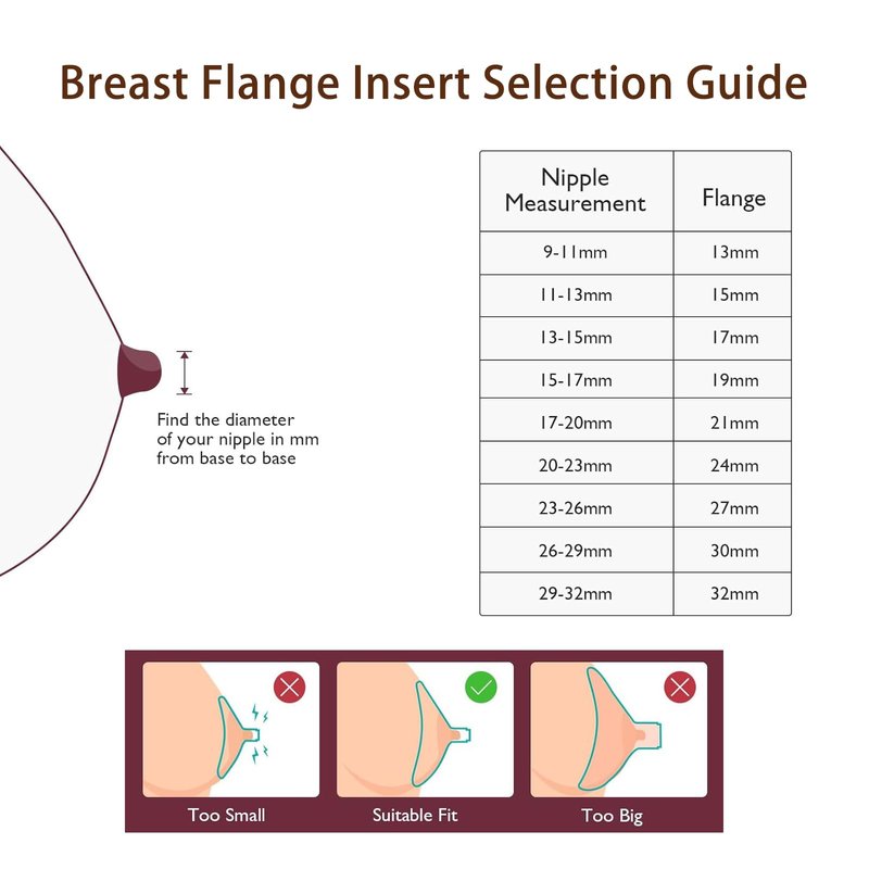 - 【Flange sizing kit】The size of the flange insert is significant for comfortable and efficient pumping. Some moms experience nipple swelling while expressing, so it is advisable to observe the appearance of the nipple during pumping. If your nipple rubs or feels squeezed in the flange channel, it is an unsuitable flange size and you need to replace the right size flange insert.